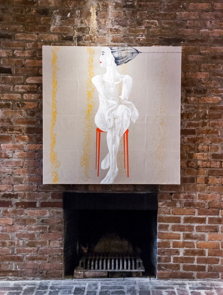While Noushin’s animals are intriguing, it is his women, or rather the single woman who appears throughout the exhibition, that steals the show. Always appearing in profile and under multiple guises, the female protagonist starring in Noushin’s work transfixes the viewer with her porcelain skin and her strong jaw line. She is turned away, she has lost interest in her audience, but where is she looking? The title of the exhibition All Her Number’d Stars suggests that her thoughts are somewhere else. Perhaps they are in the stars. While she disregards the viewer, she doesn’t appear rude or conceited; rather her mind is somewhere else. The title has been taken from the eighth book of Paradise Lost, in which Adam first meets, and consequently marries Eve. Perhaps this woman is supposed to be the representation of the first woman, no wonder then, that she attracts all attention. At times, this mysterious lady appears draped in the comic strips of Tintin, Batman and also the Iranian cigarette brand Bahman, as well as in the nude: painted in oil with a warm wash of turmeric or saffron. The two most striking images are Sonnet III (2016), oil, ink, cement, plaster, pencil, tea and encaustic on linen and Turmeric (2016), oil and 23K gold leaf on linen. In these two paintings Noushin’s heroine is seated on an armchair to the side of the image, amongst a mostly blank space. She is waiting? But for what? For whom?
