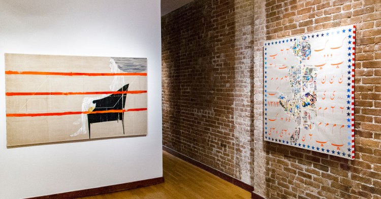The exhibition’s title, All Her Number’d Stars, has been taken from John Milton’s epic Paradise Lost (written between 1667 and 1674) and, while the written word appears throughout the display, it appears in an Iranian script, not an English one. Born in England, raised in Iran and now living in the US, Noushin’s characters fuse East and West. Captain America, (2017) oil, shellac, pencil and comic book leaves on linen, positions the silhouette of a woman covered in American cartoons, surrounded by a background of Iranian letters and numbers. While, The Hawk In the Rain, (2017), wire, paint, plaster, barbed wire and encaustic, is a three-dimensional model of a bird with its face covered in a banner that is covered in text both in English and in Farsi.