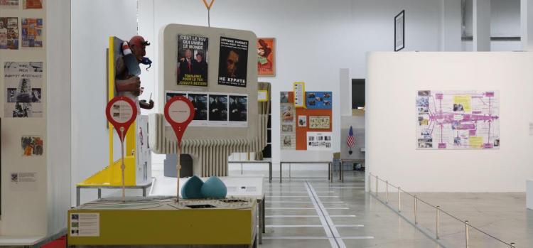 Beloufa’s robots rotate the artifacts so that our perception is constantly changing, challenging established ideas about power and society. The kinetic aspect of the exhibition inserts the notion that nothing is static and that the idea of stability is impossible. Beloufa has been quoted as saying: “If there once was a time when artists came up with images that the powers that be didn’t want to see, the powers now incite, desire, consume, and paradoxically represent freedom in this way.” It would seem therefore, that in his immersive installation, Beloufa has interpreted his artist’s role as having the authority to reposition power. He has done this through the manifestation of a three-dimensional contradiction, where his images are literally moving and changing face at every moment. Amongst flags, propaganda posters and the occasional robot, the viewer is presented with Donald Trump, Kim Jong Un and swastikas. The display causes a feeling of unease and confusion – exactly what the artist intended. Amongst the robots are also video games and re-imagined film posters in which military figures have replaced cartoon characters. It is as though Beloufa wants to instil in us the idea that life is a game, and while we can play along and see where the journey takes us, we also have the power to switch the way we are playing.