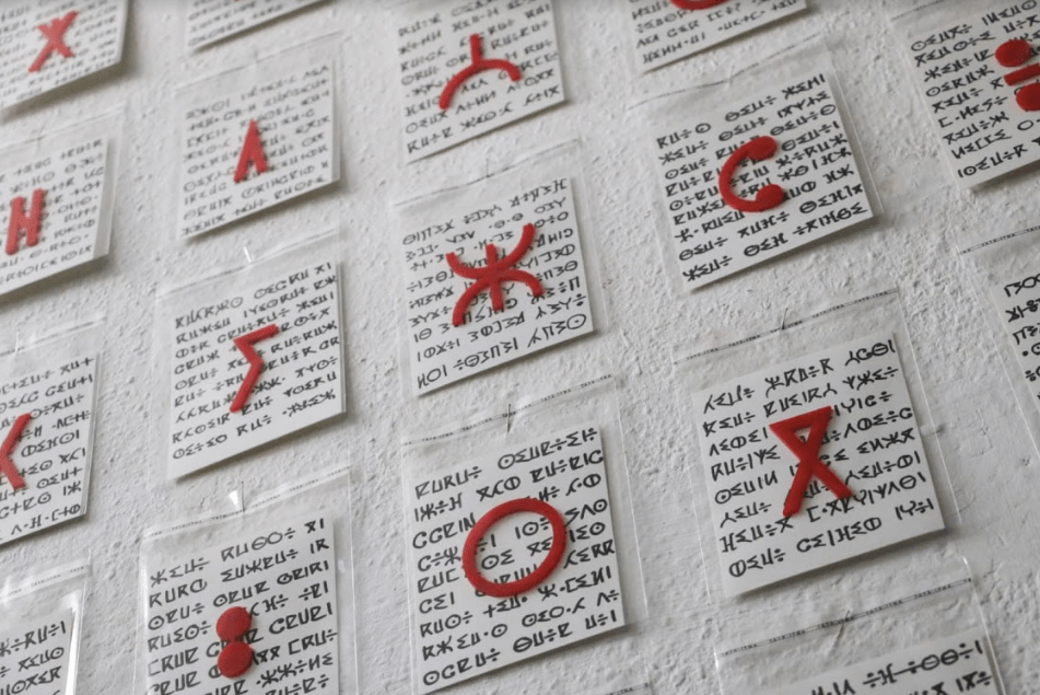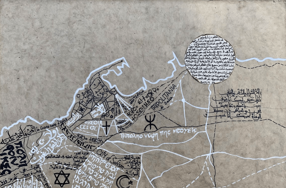 Now though, Tewa is based in Berlin, though Waraq is still functioning from Libya. She explains that in Germany she continues to be confronted with people telling her “this is the first time i’ve met a Libyan.” Tewa’s own artwork tackles the idea of identity, what it means to be Tamazight and from Libya. “This is an issue that increased when I came here”, she says, “There are always labels that you’re an Arab, but no I’m not.” Her work comments on issues related to Tamazight civilization, incorporating the Tifinagh calligraphy. “I started writing the language a few years ago. It’s my mother tongue”, she says, though she was never taught to read and write because the language was oppressed. In one particular work, Tifinagh Evidence, the Tifinagh letters are placed in plastic bags like crime bags. ““It shows how this language was seen as a threat”, explains Tewa, “It’s an ongoing conversation. There are many uprisings for tamazight rights and they’re ongoing.”