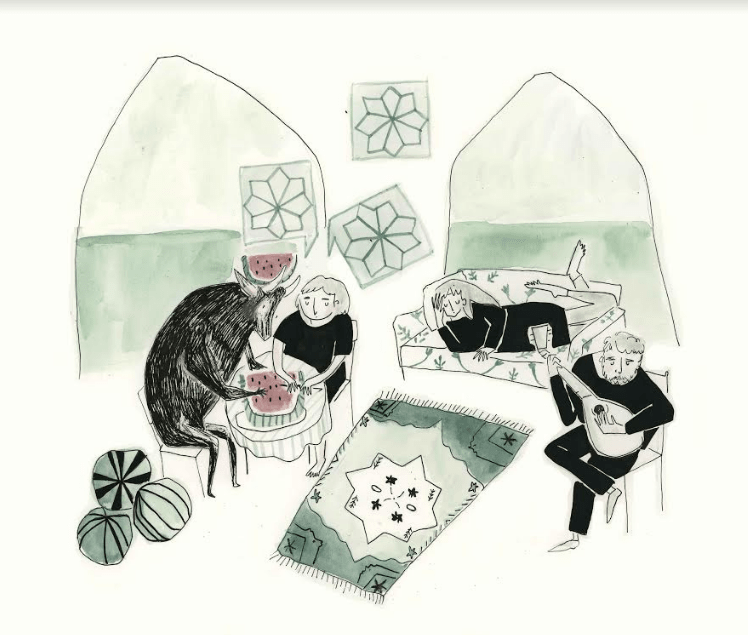 One thing that is special about Zahra’s work, is its endearing and childlike quality. “There’s a certain light-hearted feeling in watercolour”, she says, “The people are very simple, they always have triangle noses and dot eyes.” And speaking of watercolour, Zahra likes the medium because she can add layers.