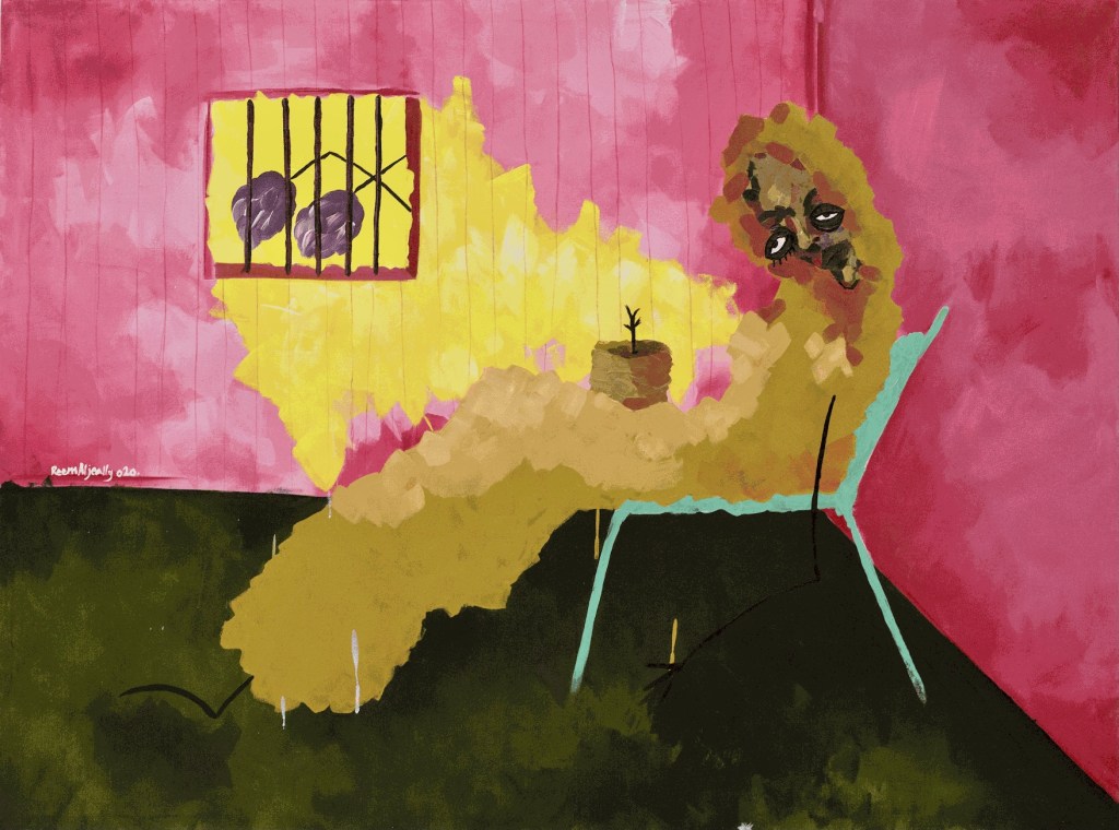 Recently, a painting that Reem made during the pandemic has been exhibited at the Middle East Institute’s gallery in Washington, D.C. She explains that the painting – Room 306 – gives a sense of how everything around us has changed. “It definitely affected the type of painting that I was making”, says Reem, “I started to develop a new style. I had more time to work with it. I focus on highlighting the eyes and the features of the face. They’re very intense and very clear that this is the focal point.”