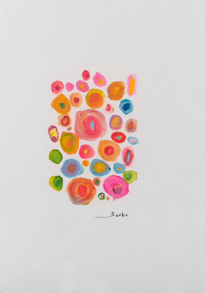 The metallic Identity, though constructed from harsh materials like chains and metal, appears gentle and feminine. “It’s funny how you say that, because it’s all metal”, says Sarko, “But that’s how women are too, hard but delicate.” And, in addition to the confusingly dainty Identity, were 40 small watercolour works on paper titled Something Small. Bursting with colour and feeling, they were hung in the space in the order of the Fibonacci sequence in the shape of a circular pattern. The works were made at the beginning of the Armenian lockdown on scraps of paper Sarko had to hand, though instead of seeming woeful and grey, they are the complete opposite. “They’re a little bit crooked and not touched up properly but I decided not to touch them because nothing is really perfect anyway”, explains Sarko, “I usually force myself to be in solitude to actually paint or create but this lockdown was a given one. I had this immense strong gratitude for everything. I feel like that’s why I had a lot of love in me even though there was covid and separation, but I was like, oh wow world, I love you, you’re so real. My reaction to the lockdown was very positive. I was feeling grateful the whole time. I was appreciating everything I would eat, every beautiful thing in my life…which is why my works became so positive too.”