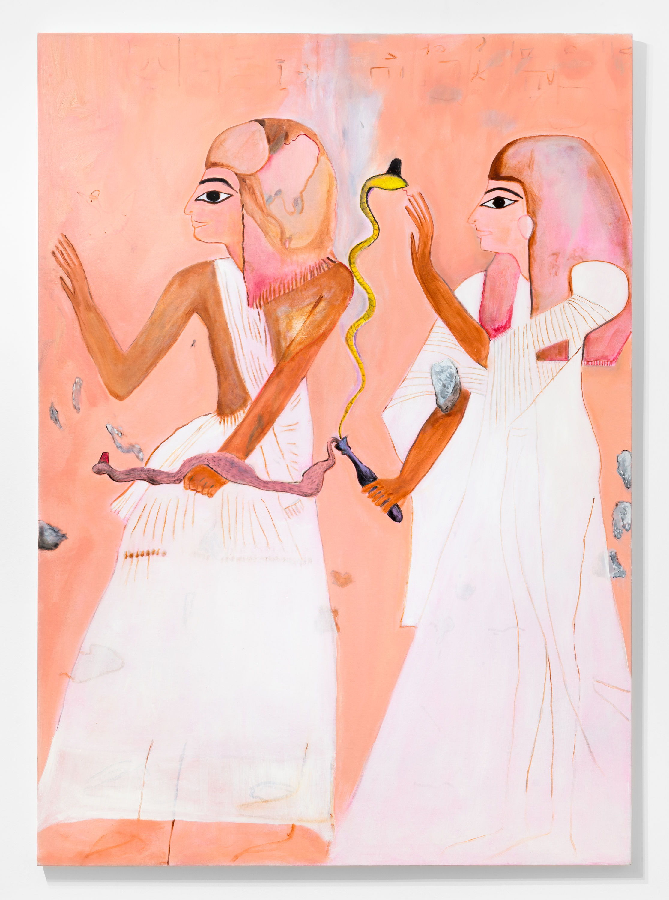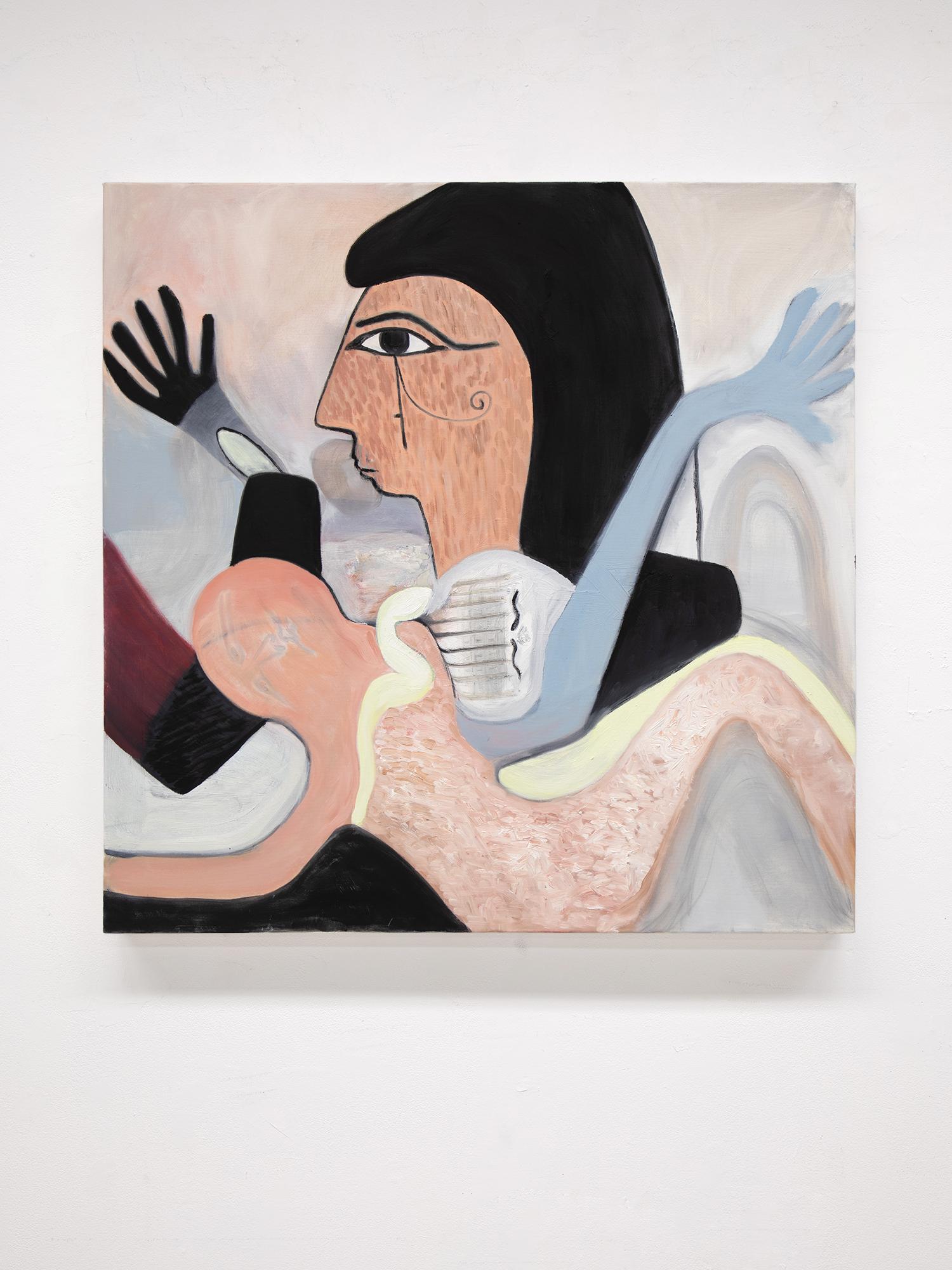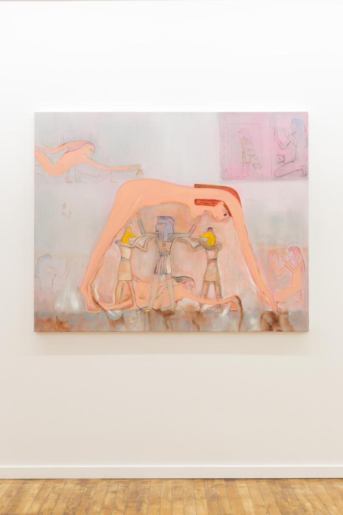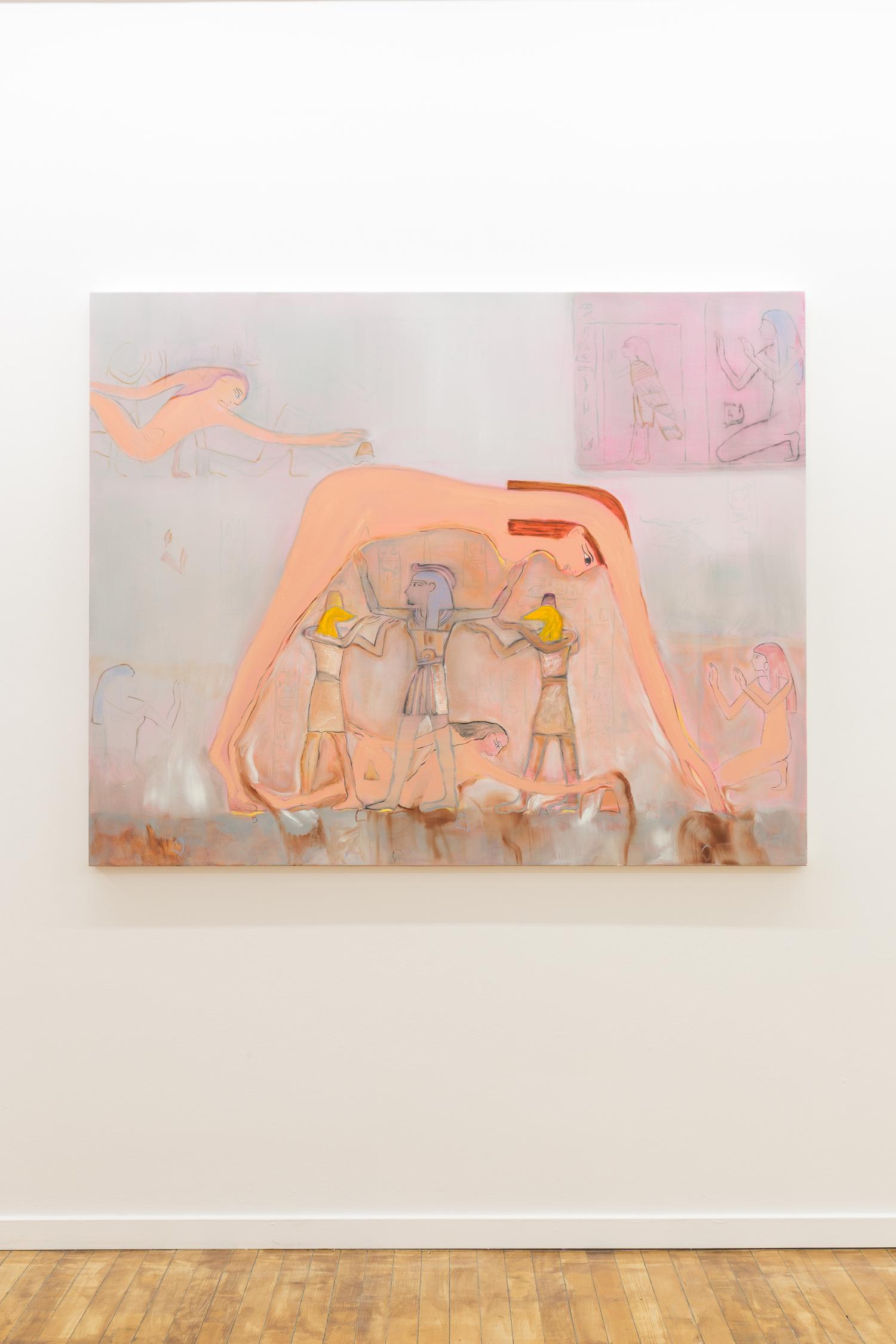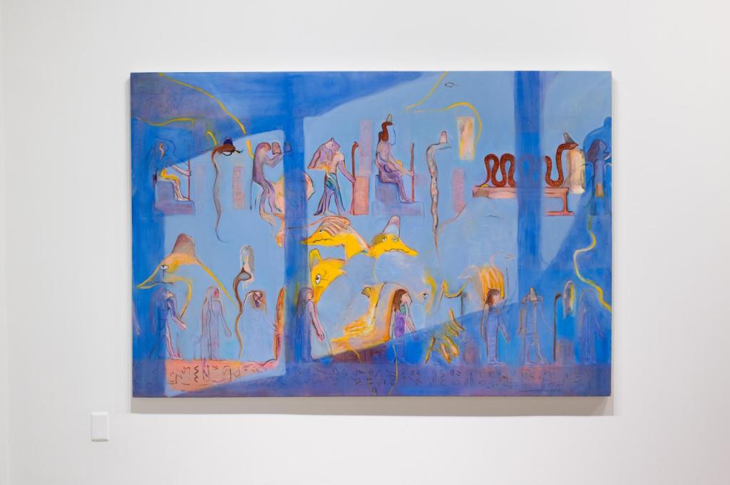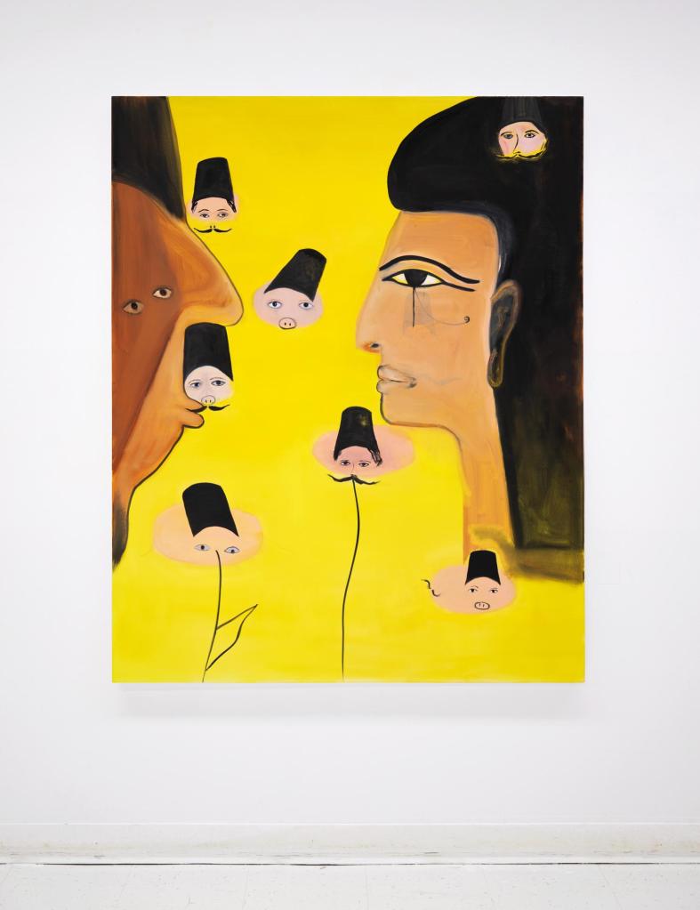 When Muriel started her MFA three years ago, she found that she had been given a container in which to focus on her family heritage. At this same time there was a lot of conflict in Artsakh, which continues to this day and is now under blockade. As a consequence she conducted a lot of oral history research. “Initially I was working a lot with the Armenian Genocide, representing Talat Pasha, the orchestrator of the Armenian Genocide”, says Muriel, “I was going at it from a very raw perspective, delving into the paintings and creating a story with each painting.” During her MFA, her father’s health declined, causing him to lose his capacity to speak, prompting a need to also delve into her Egyptian heritage, implementing Egyptian iconography into her work. “I realised that Egypt was the land where my family on my mother’s side was able to reconstruct their lives”, she says, “It became this safe space from which I can rewrite this story.” As a result, you will see aspects of ancient Egyptology in her work, gods, and pharaohs representing different people in her family within these paintings.