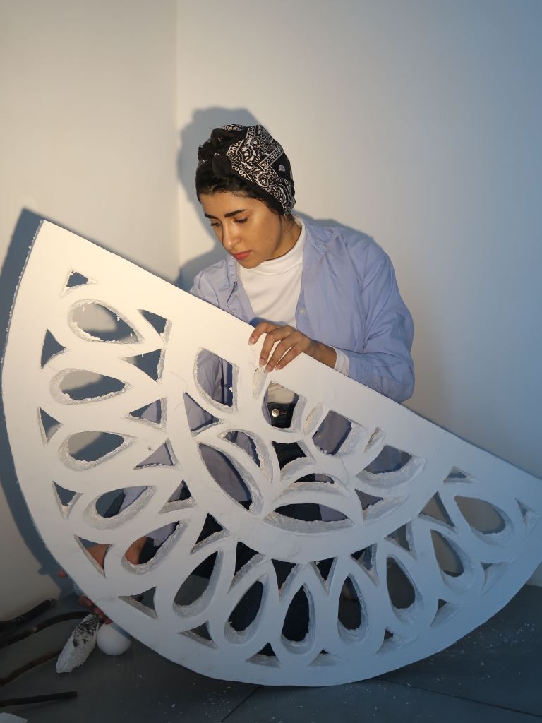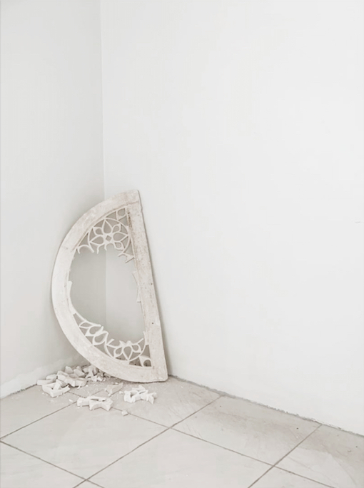Much of Afraa’s work centres around the qamariya, a Yemeni architectural motif that resembles a crescent moon, qamar being the Arabic word for moon. This motif is a type of window that is located on top of most Yemeni homes, fabricated from gypsum and stained glass, radiating colourful shapes when the sun hits it. “In my work I use it as a metaphor for home”, explains Afraa, “The way I see and experience the notion of belonging and what does it mean to be home or not.”