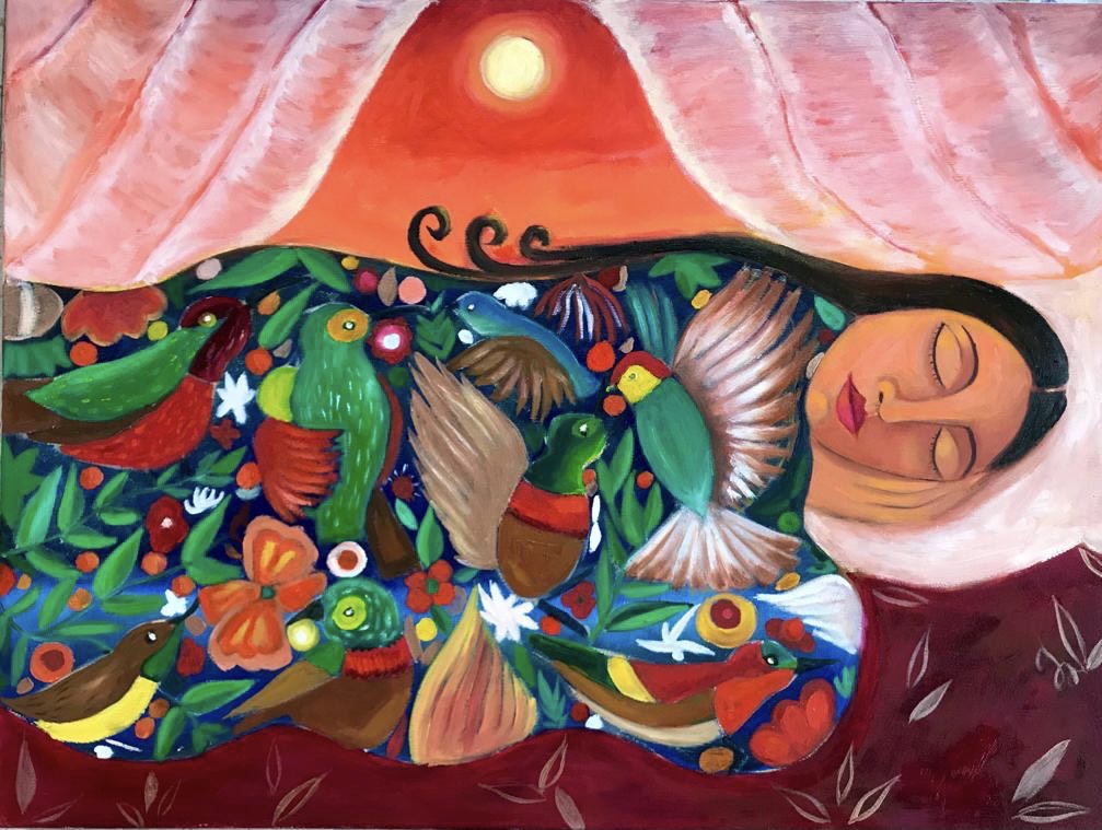 Malak’s art also has a dreamlike quality, she explains that this feeling started while she was studying Political Science and International Relations in Istanbul during the pandemic. “I just wanted to paint something that is very tranquil, very peaceful, and that would bring me joy every time that I look at it”, she says, “So I started this series of sleeping women. It’s simply a woman sleeping, and I used patterns that are inspired by different tapestries from different parts of the world.”