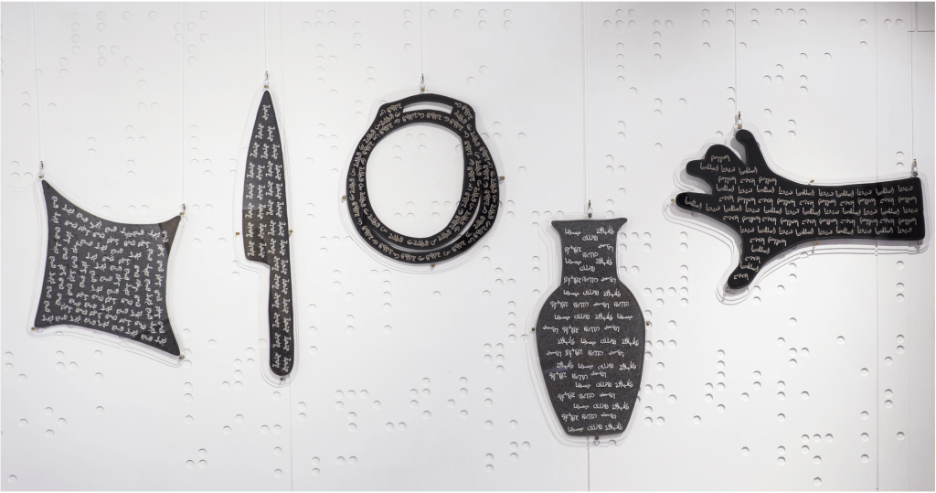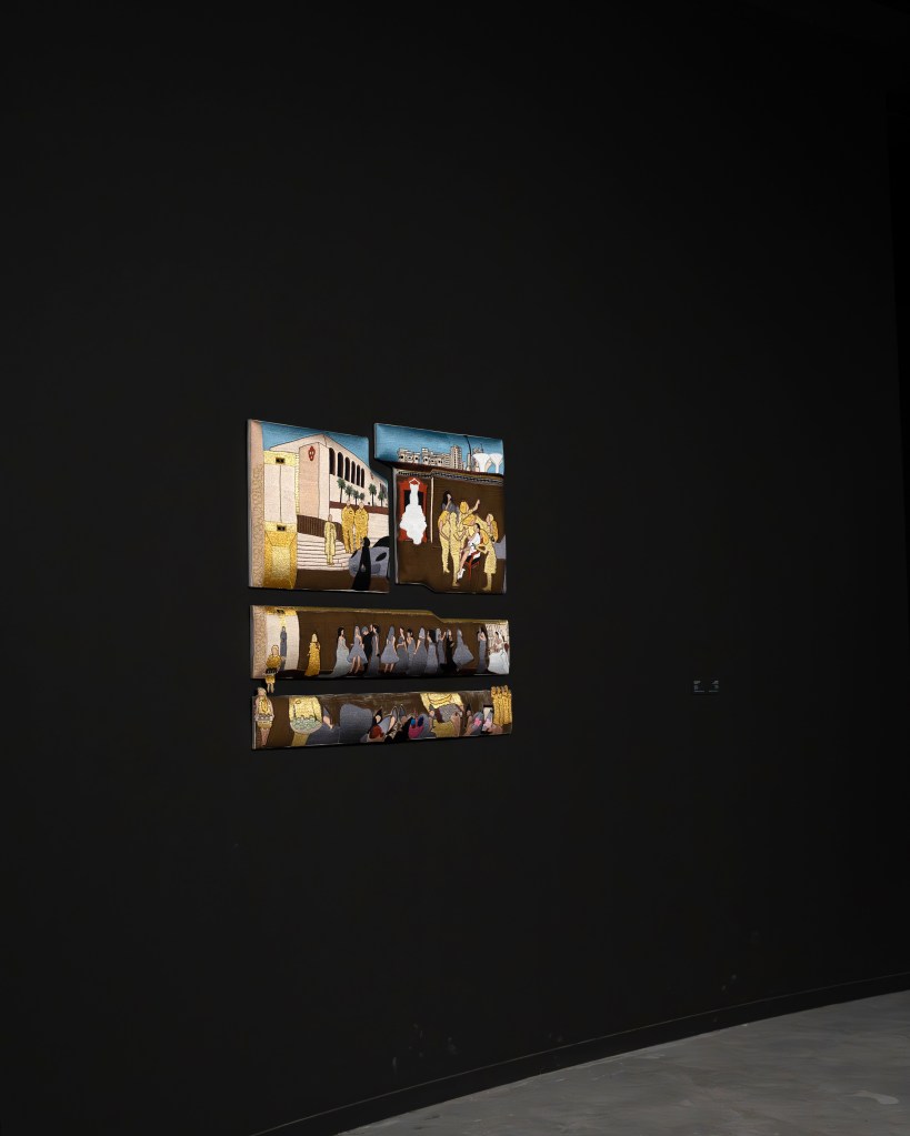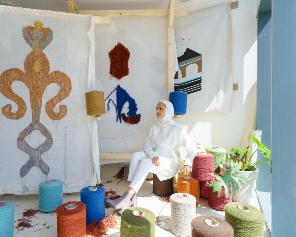 While Amani works with textiles, which have hundreds of years of tradition, she also works with modern technology. “For me it’s more interesting to mark the qualities of this period of time that we’re in”, she says, “Each of my artworks talk about specific moments in time and marking in history. So I feel it’s very important to utilise these technologies. It’s actually very inspiring because the possibilities are endless.” On the other side, she’s also worked with the Kuwaiti embroidery of Sadu. She worked directly with the weavers, listening to their stories. “I love that Sadu is a way of storytelling”, she adds, “I always try to think about the ways we can talk about our current times with this old technique and implement new ways of storytelling through this traditional material and way of creation.”